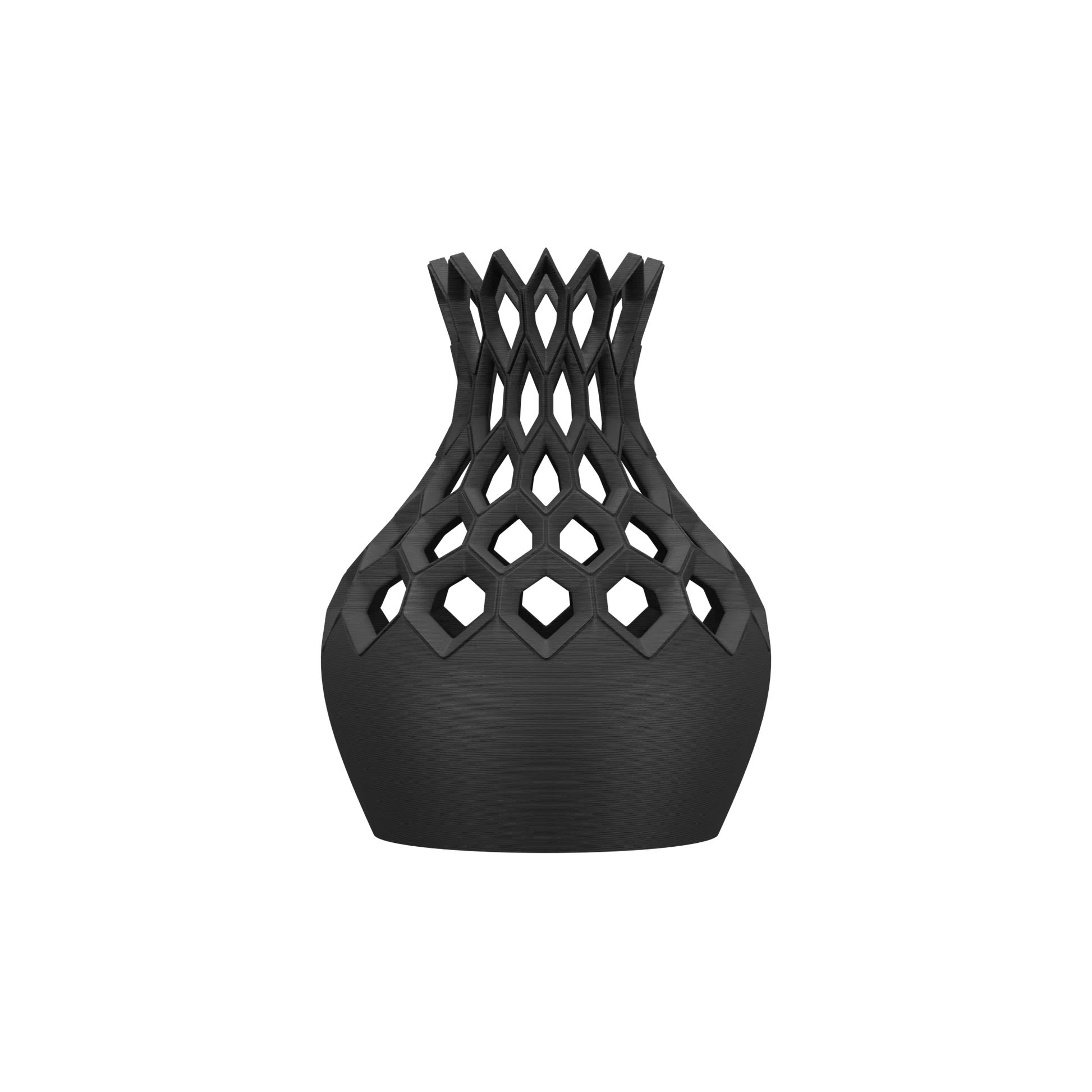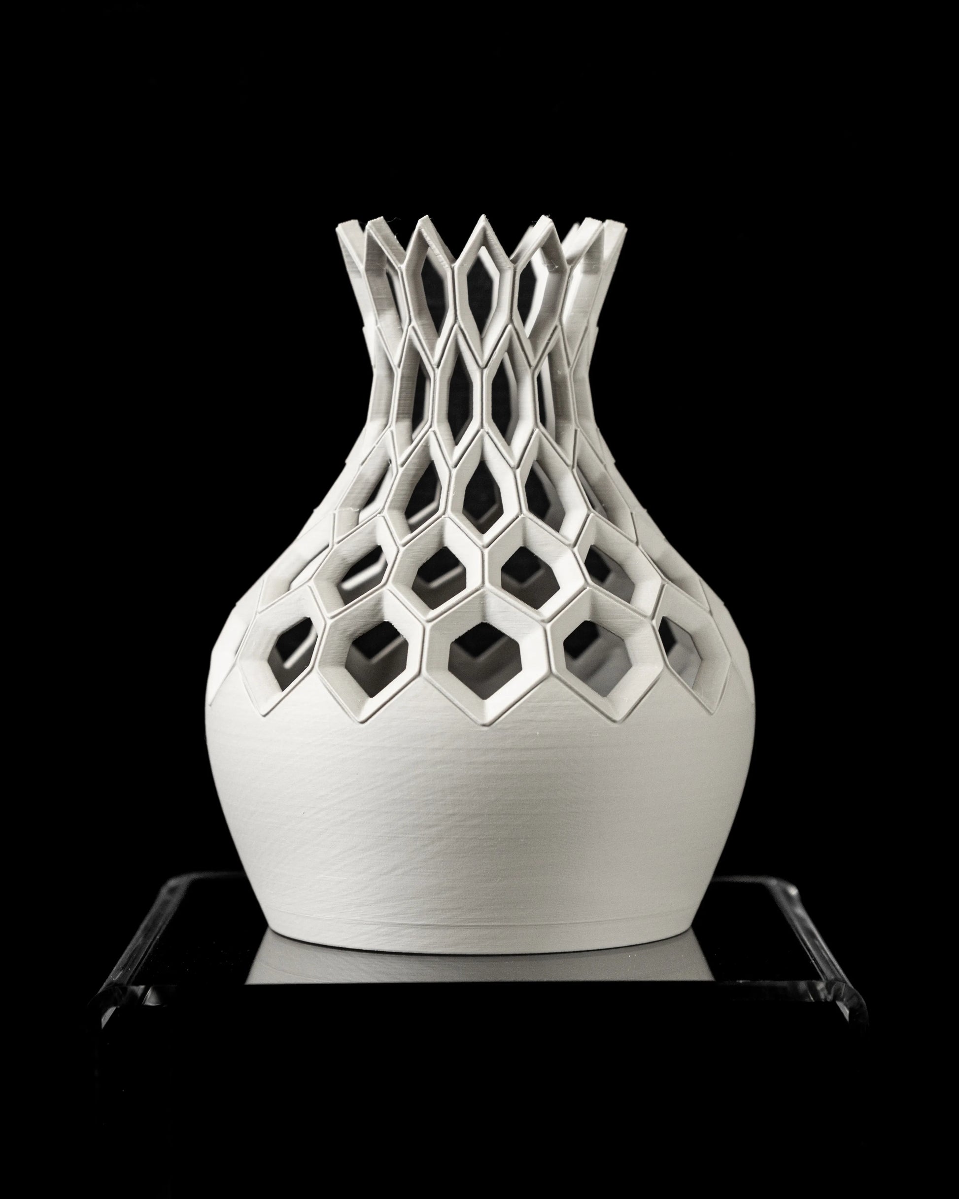 Ses lignes courbes sont rythmées par un réseau d'alvéoles hexagonales, créant une pièce sculpturale où le plein et le vide dialoguent. La texture satinée de la matière accroche subtilement la lumière, soulignant chaque facette de ce design audacieux et transformant ce vase en une véritable œuvre d'art pour votre intérieur.