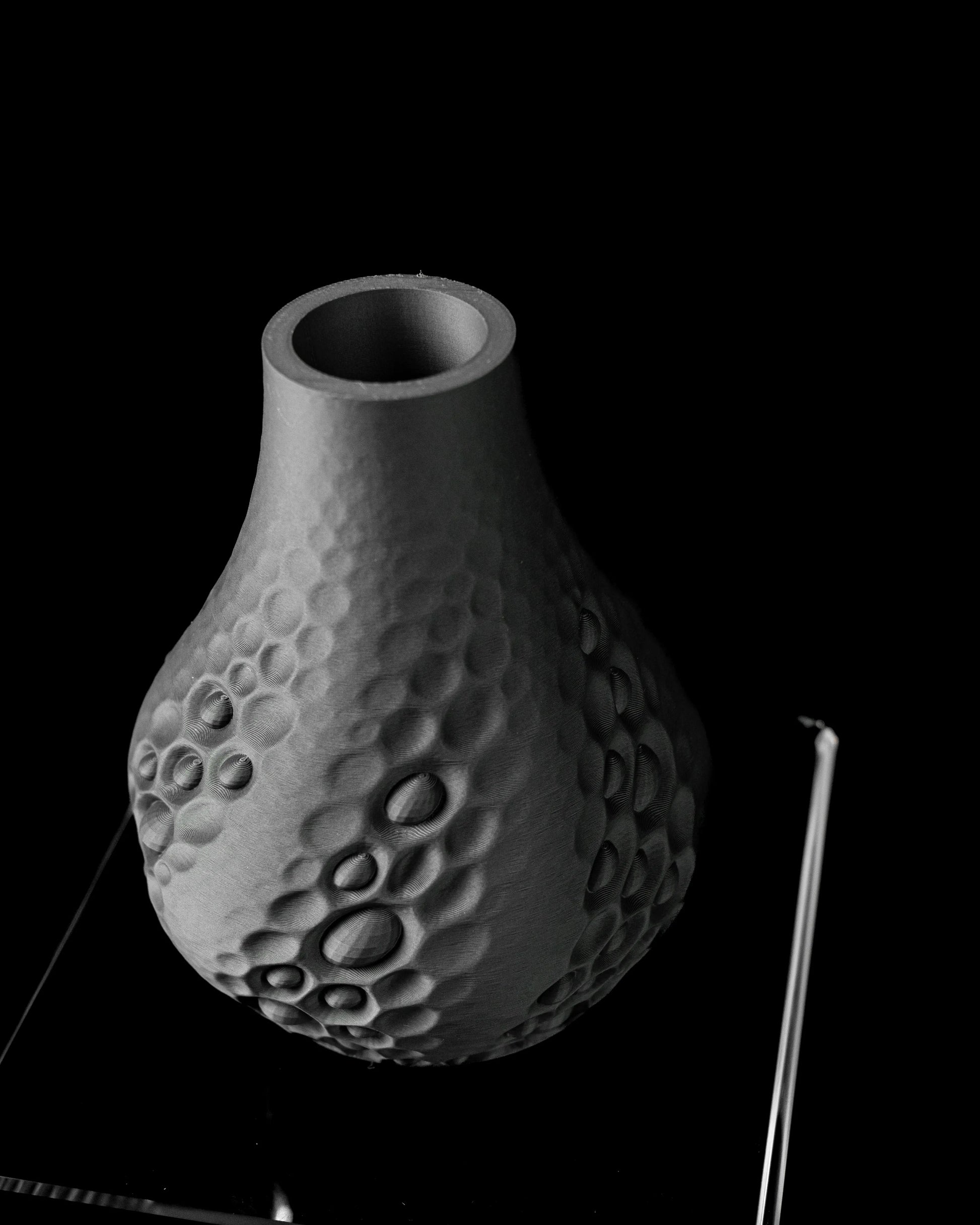 Le Vase Pearl se distingue par sa silhouette organique et sa texture alvéolée captivante, évoquant une surface lunaire ou des perles délicatement fusionnées.