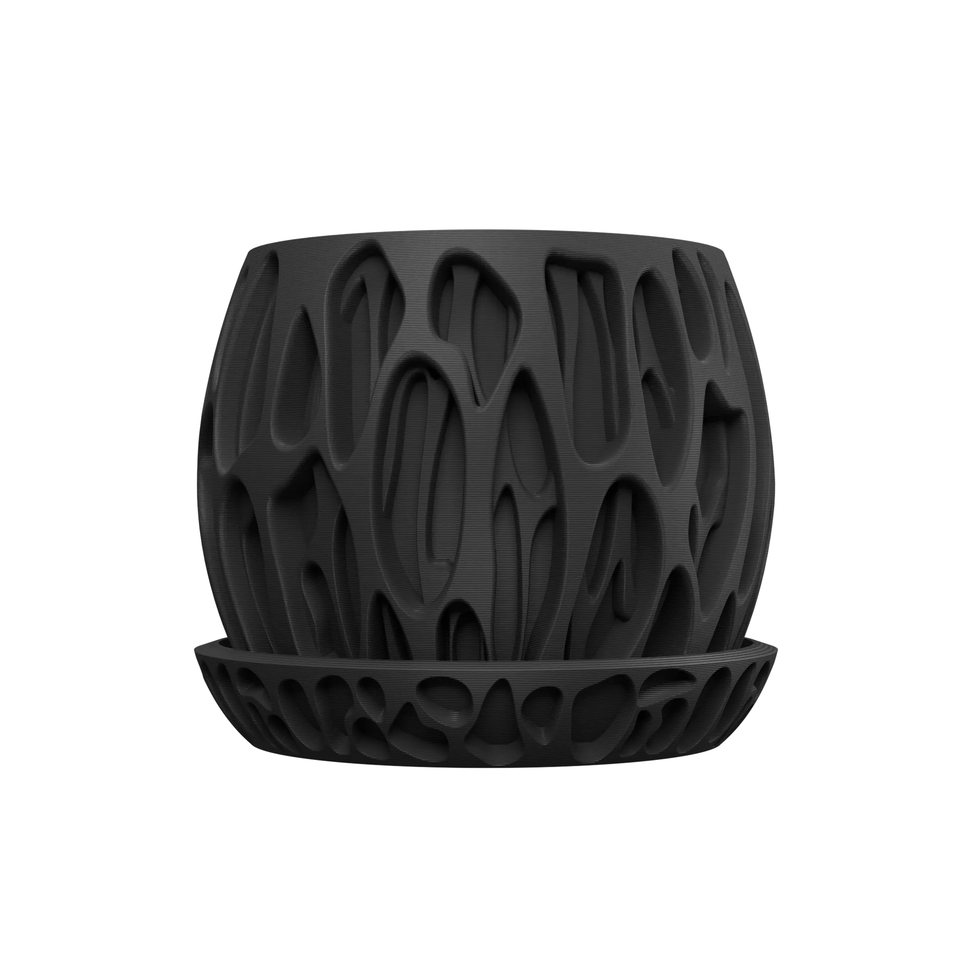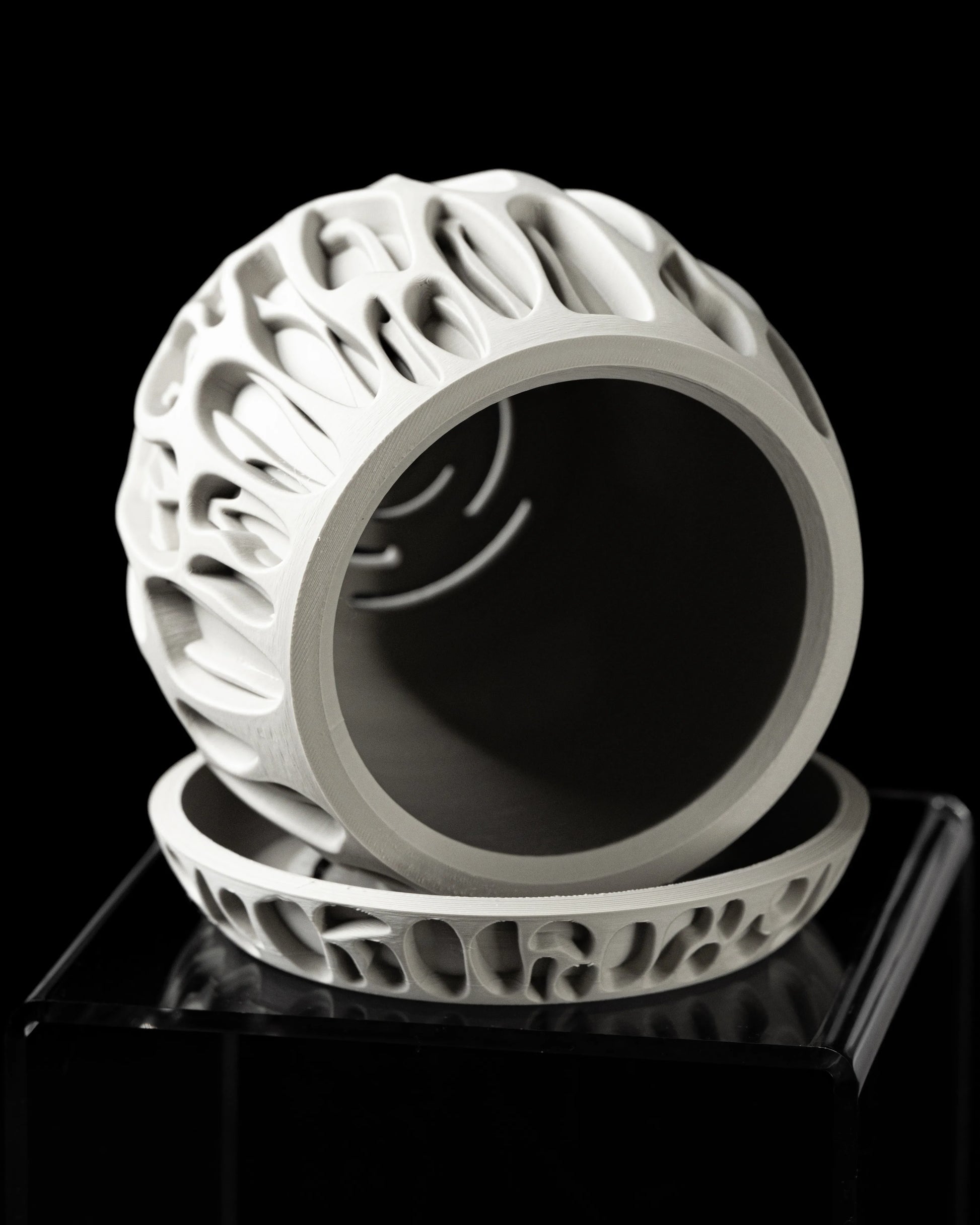 Ses courbes sphériques et fluides évoquent un mouvement naturel, presque vivant. La texture alvéolaire, composée d'une myriade de cavités interconnectées, donne à l'objet une profondeur visuelle unique. Chaque angle révèle de nouveaux détails, faisant de ce pot une véritable pièce sculpturale qui interagit avec son environnement lumineux.