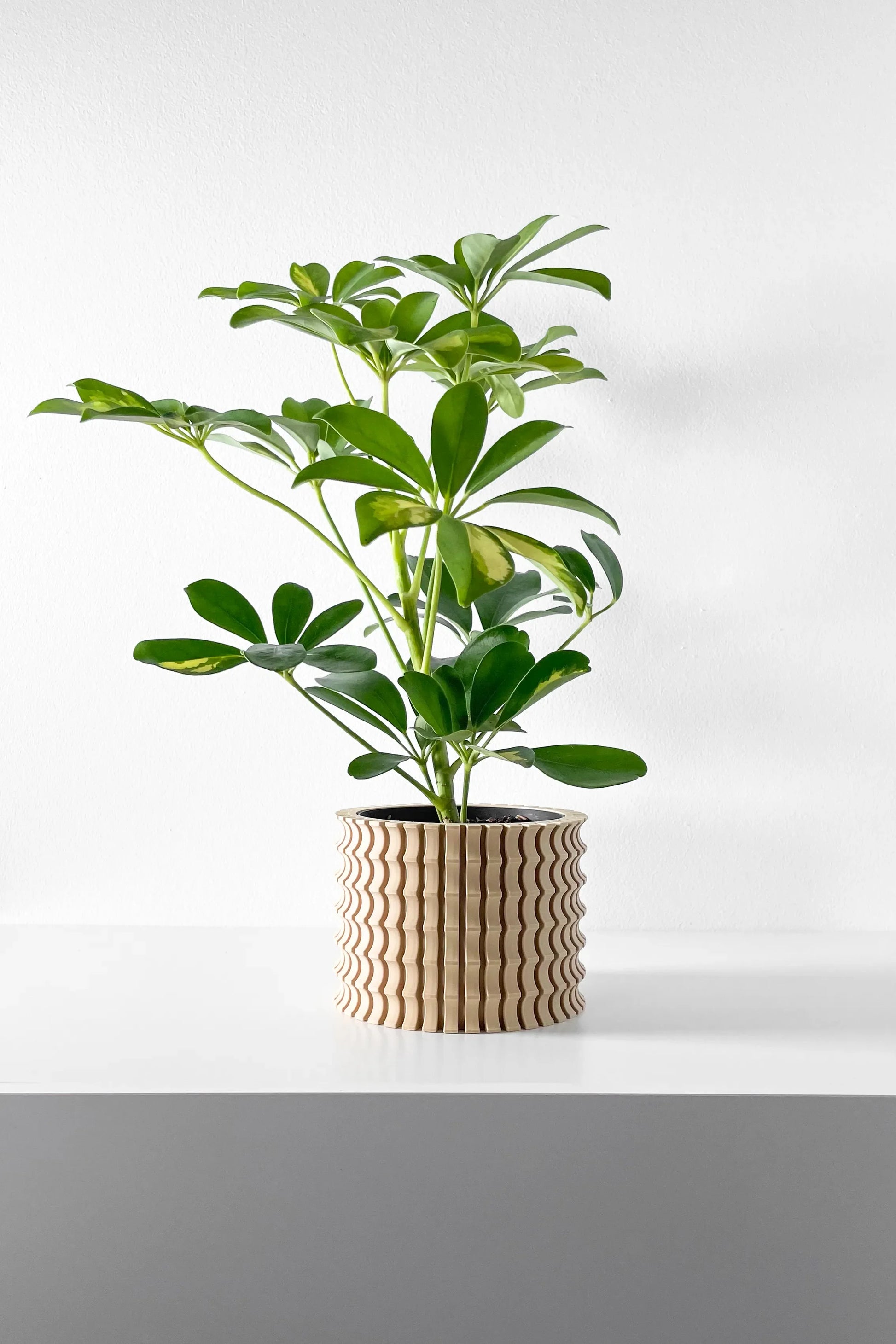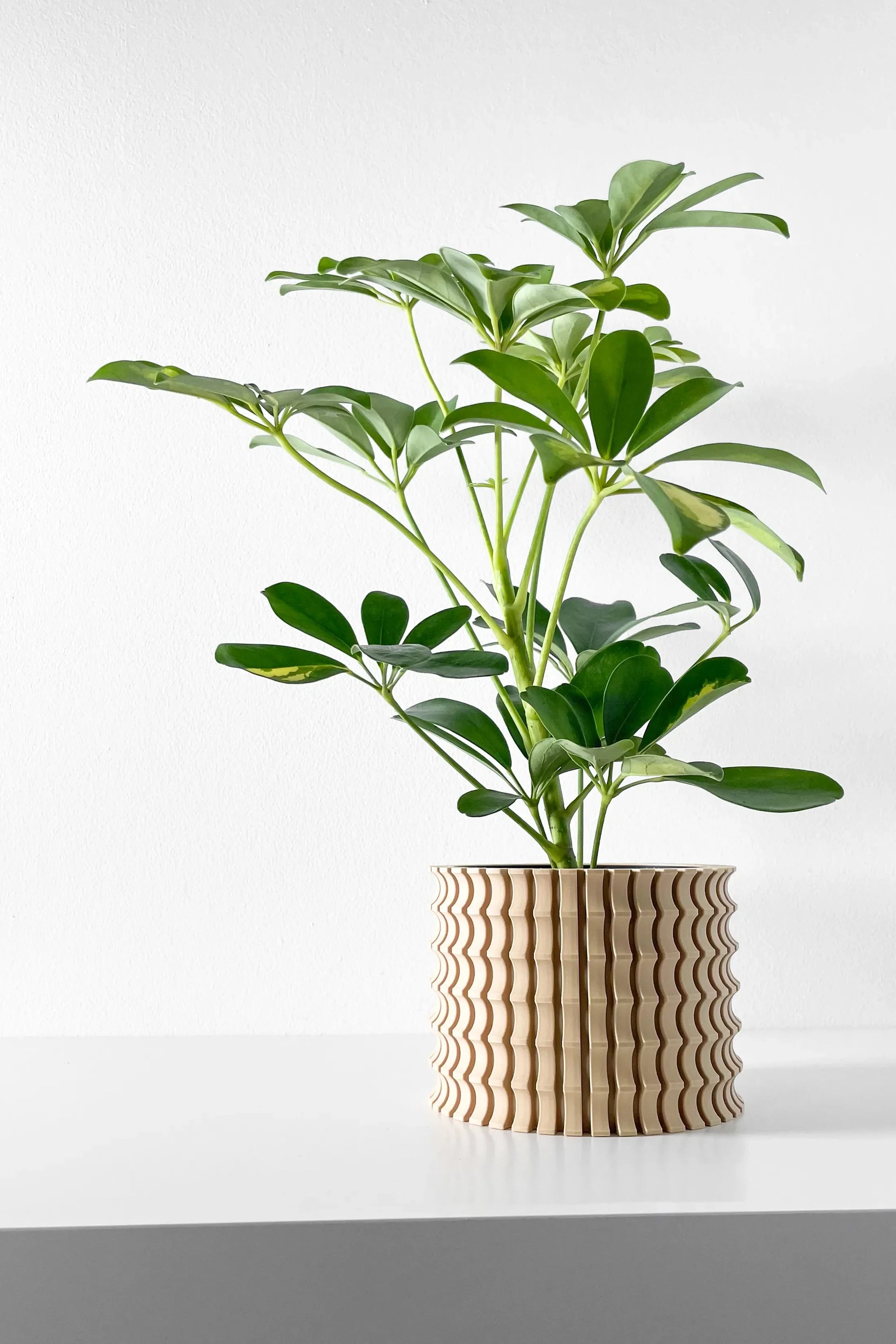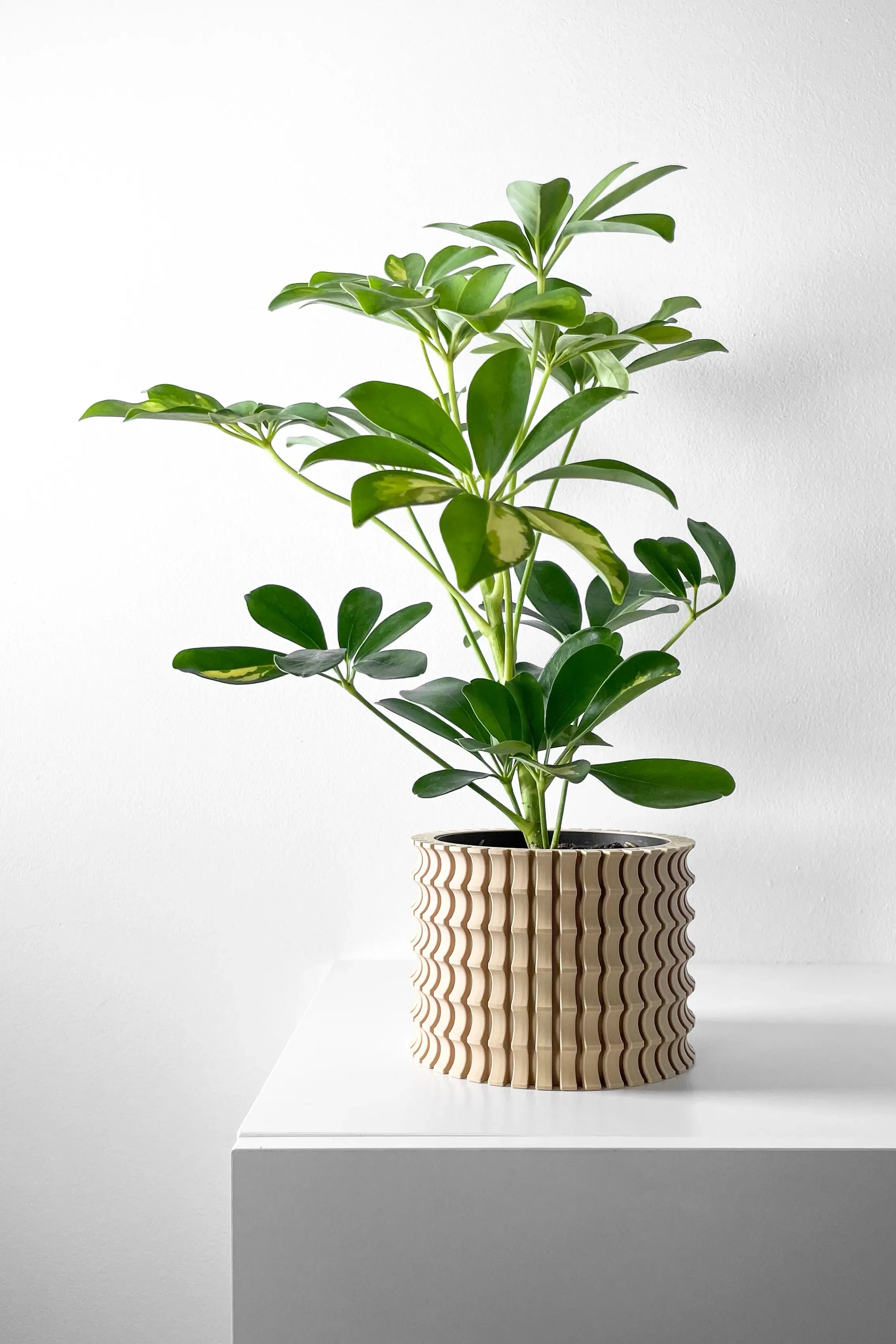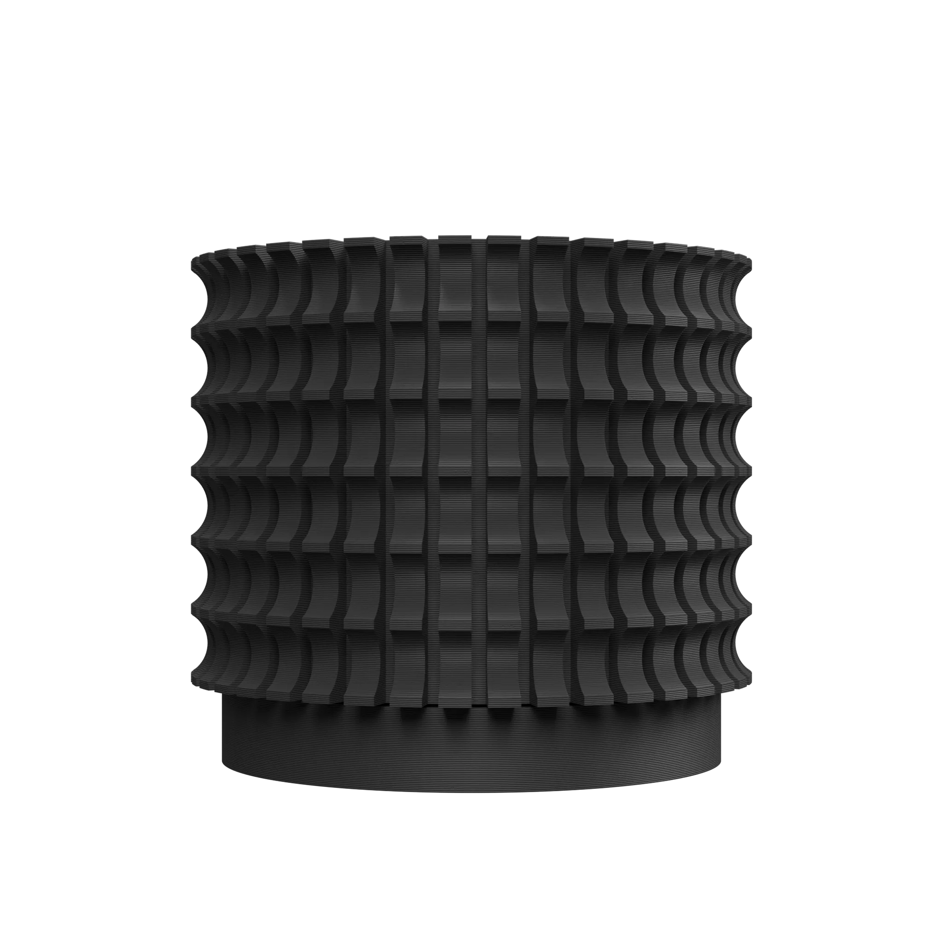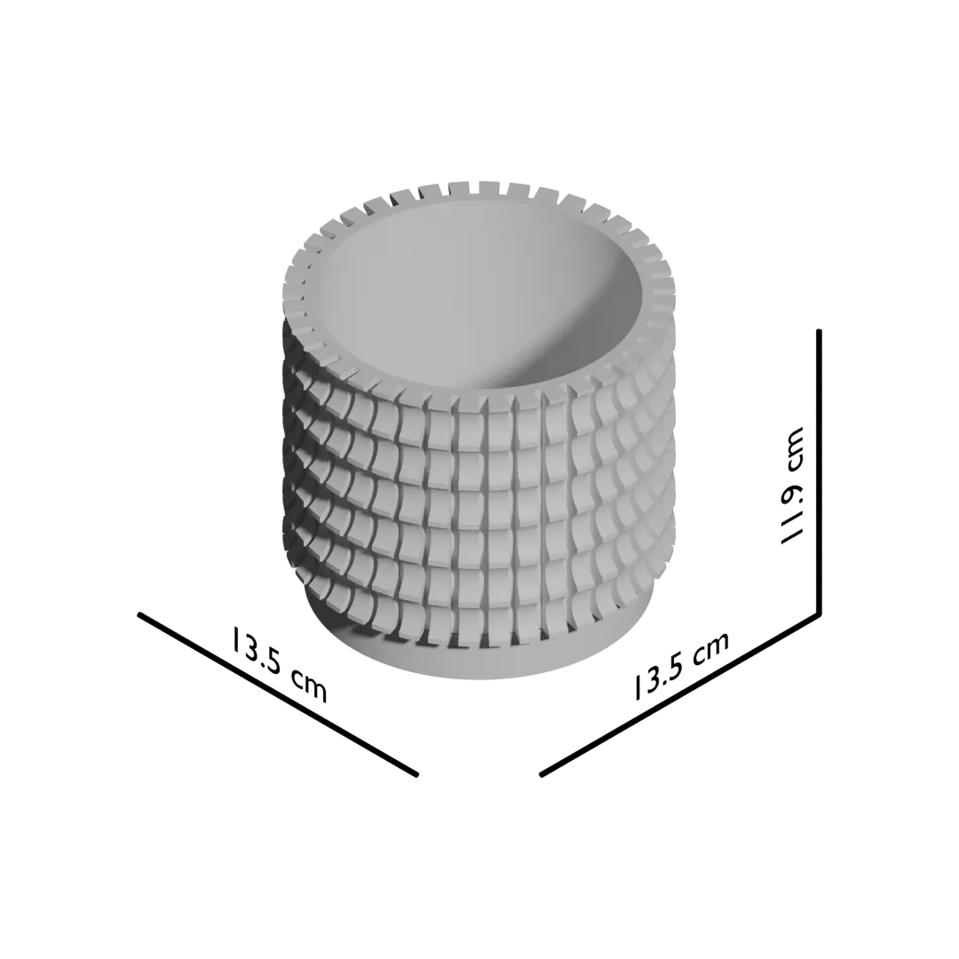Ses lignes ondulées sont rythmées par une grille de motifs concaves qui captent la lumière, dessinant des ombres subtiles et changeantes. Chaque détail de sa géométrie complexe transforme ce pot en une véritable sculpture, apportant relief et modernité à votre intérieur.