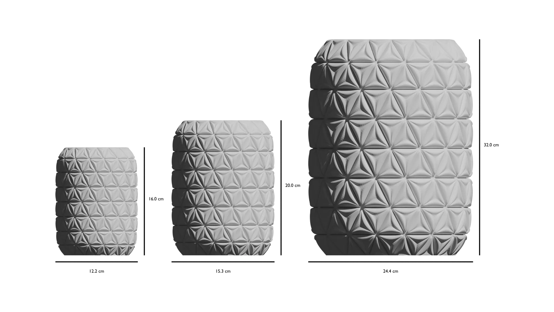 Ses lignes pures et cylindriques sont magnifiées par une texture géométrique complexe. Chaque facette triangulaire capte et réfléchit la lumière de manière unique, transformant ce vase en une véritable sculpture moderne. L'interaction entre l'ombre et la lumière sur ce maillage tridimensionnel offre un spectacle visuel captivant sous tous les angles.