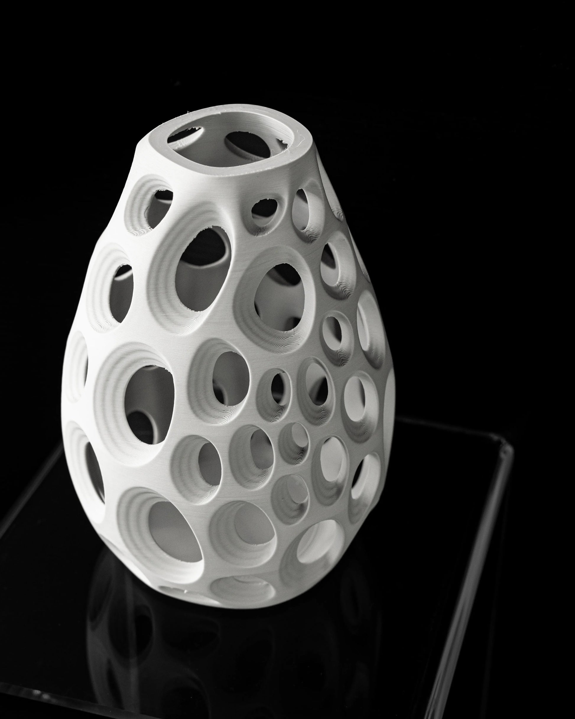 Le Vase fleurs séchées Ringo se distingue par sa silhouette organique audacieusement perforée de multiples cercles, créant une structure alvéolaire fascinante.