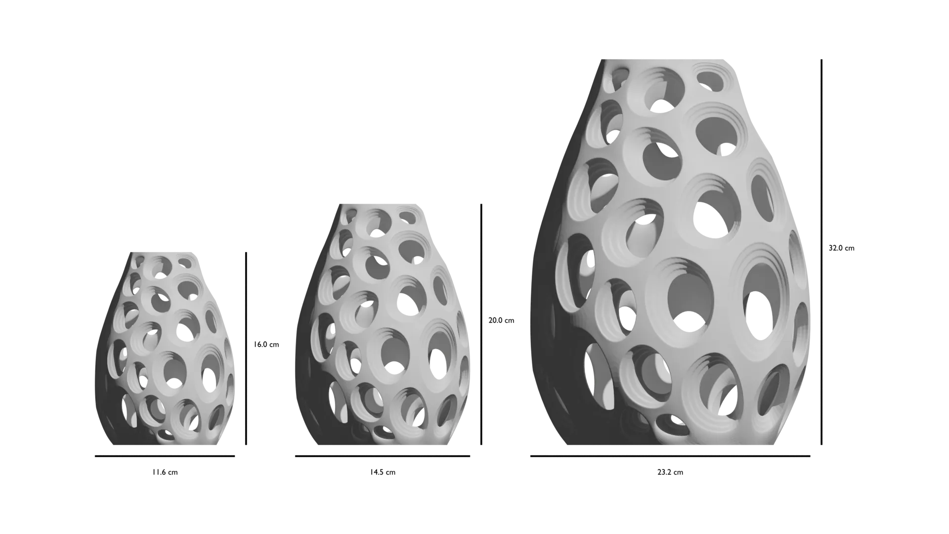 Ses courbes douces et sphériques sont rythmées par un jeu de vides et de pleins. La texture ajourée, composée de cercles concentriques, capture la lumière de manière unique, transformant ce vase en une véritable sculpture graphique qui dialogue avec son environnement.