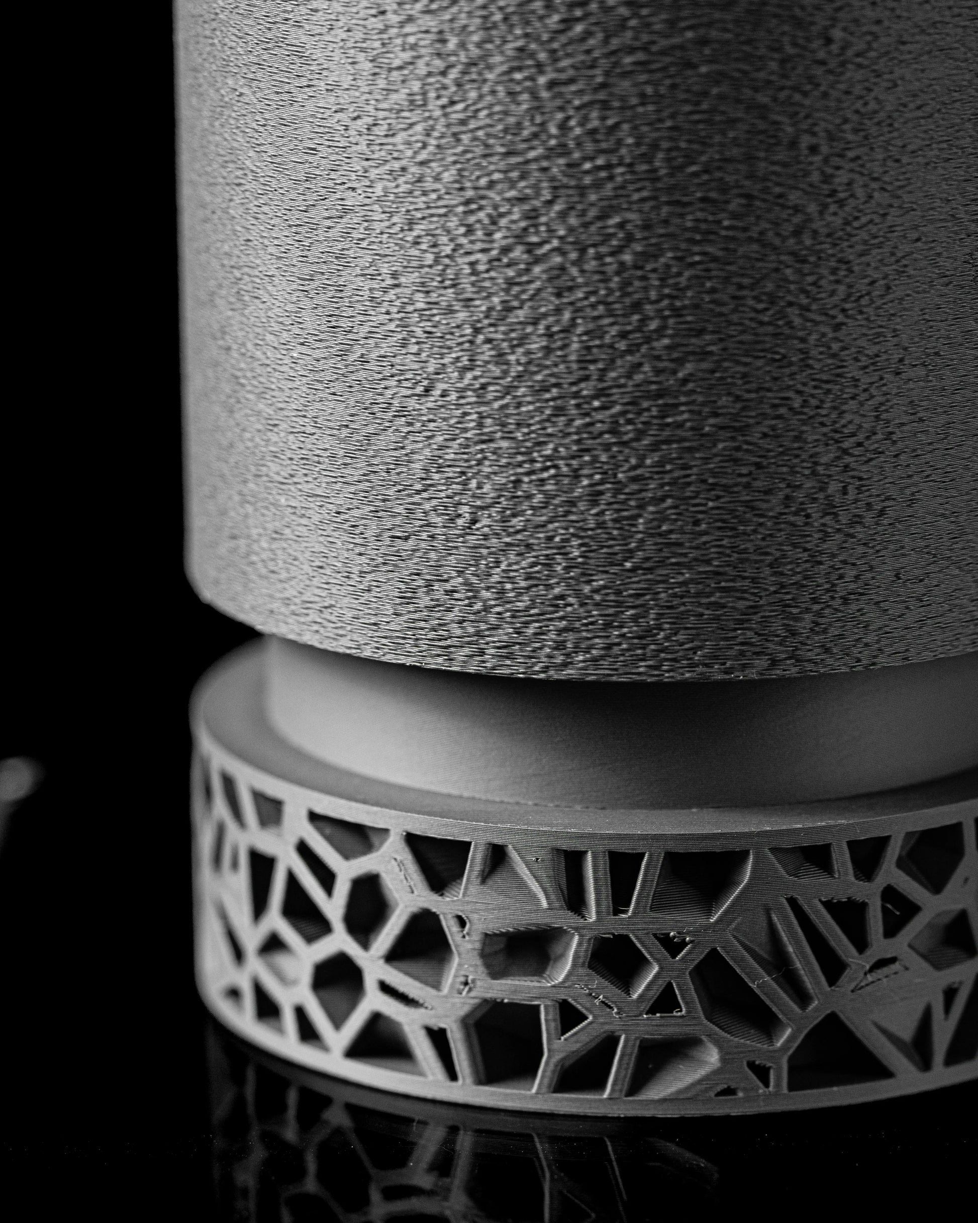 La sua struttura in due parti crea un accattivante gioco di volumi. La parte superiore, dalle linee pulite, contrasta con la base, la cui complessa maglia interagisce con la luce, proiettando delicate ombre e conferendo all'oggetto un forte carattere scultoreo.