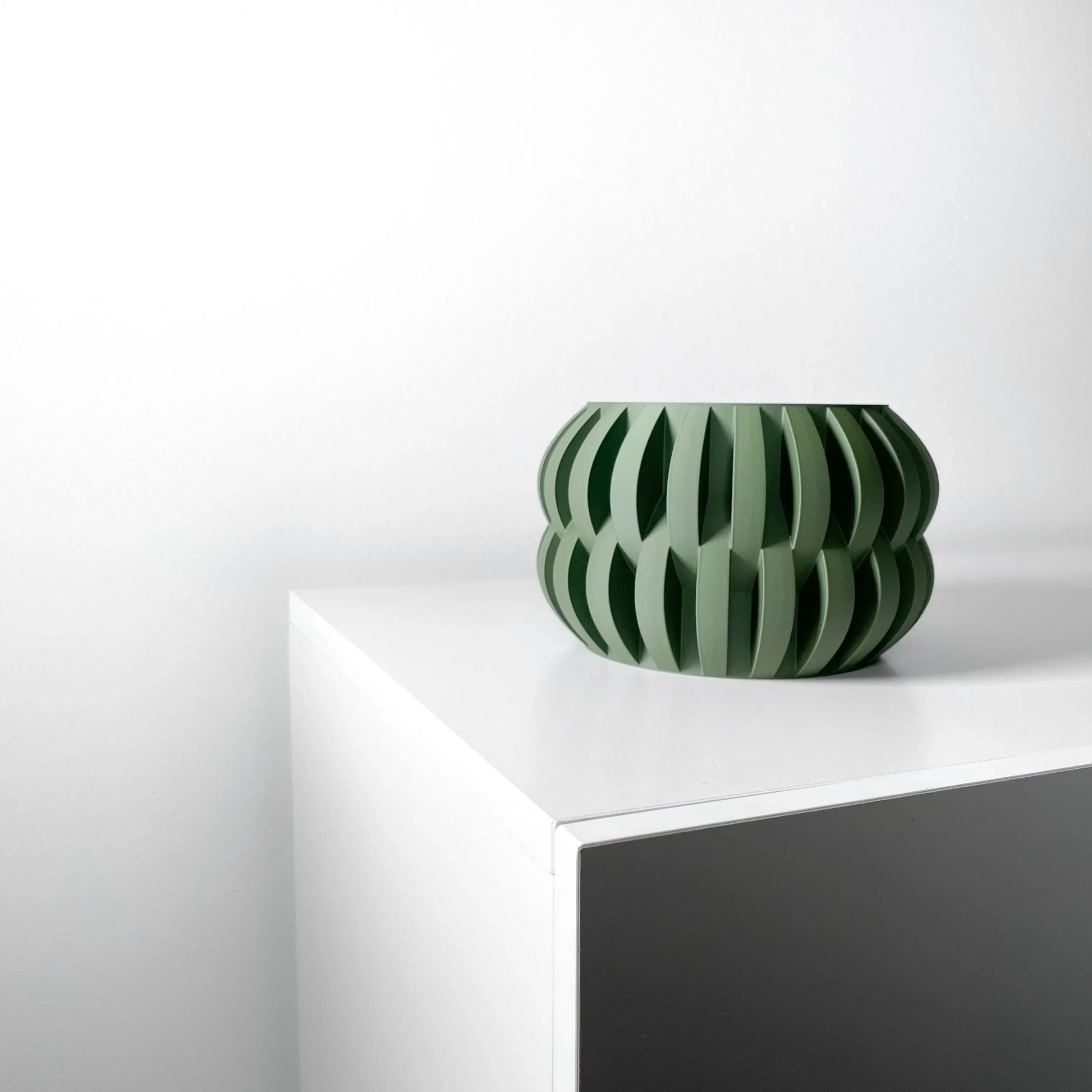 Le pot décoratif Povan se distingue par sa silhouette généreuse et sphérique, rythmée par des cannelures verticales qui lui confèrent une présence sculpturale unique.
