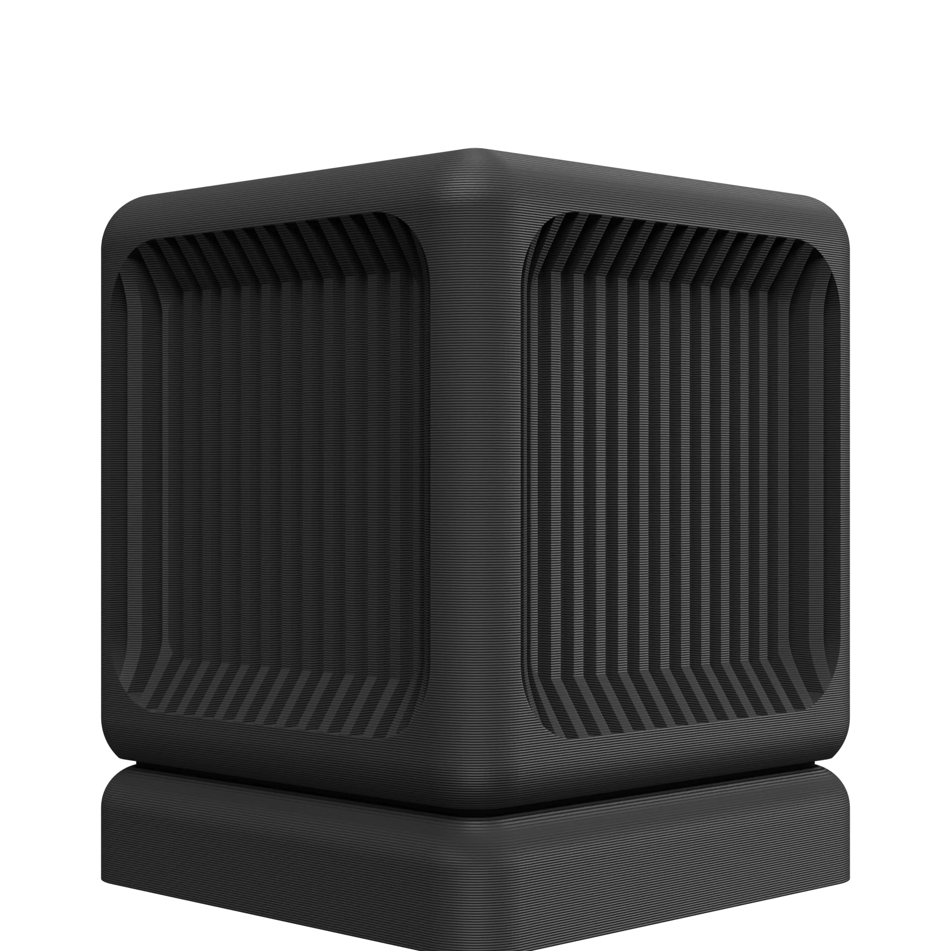 - Forme : Une silhouette cubique aux angles largement arrondis, posée sur une base stable.