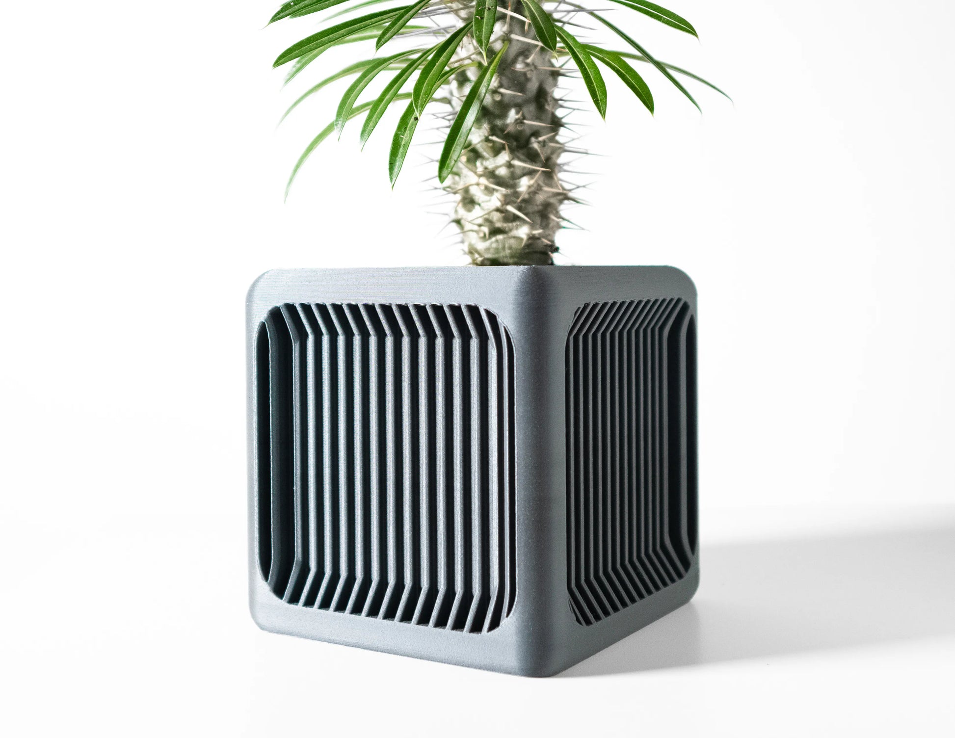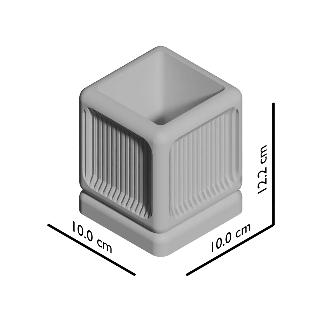 Ses lignes géométriques, adoucies par des angles généreusement arrondis, dessinent une forme à la fois robuste et élégante. La texture cannelée verticale qui habille ses faces renfoncées joue avec la lumière, créant un rythme visuel captivant et des reflets subtils qui animent la surface. Cet objet devient une véritable sculpture pour vos plantes.