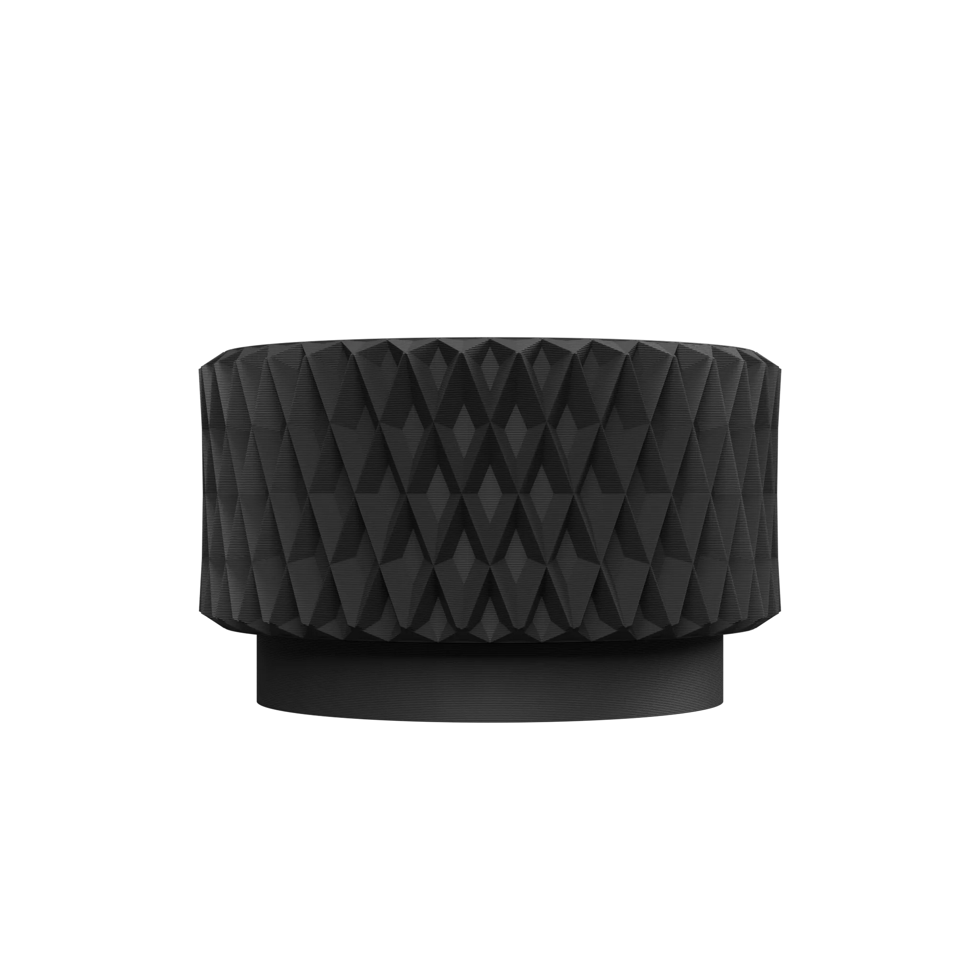 Ses lignes pures et cylindriques contrastent avec la complexité de sa texture. Chaque facette en forme de diamant est conçue pour interagir avec la lumière, créant des jeux d'ombres et de reflets qui animent la surface et confèrent à l'objet un caractère sculptural et moderne.